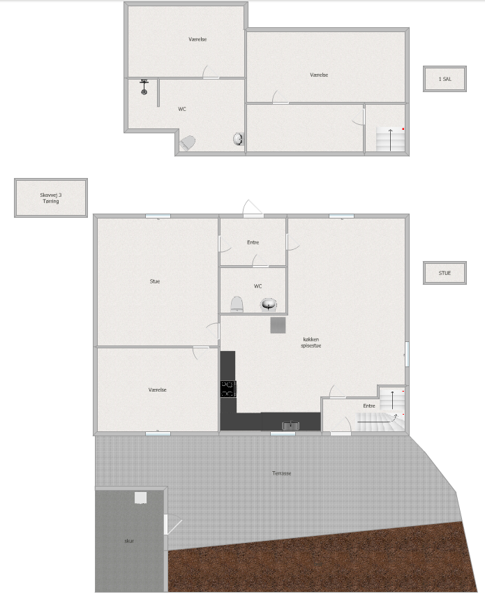 1 sal: Stort badeværelse, samt 2 værelser.